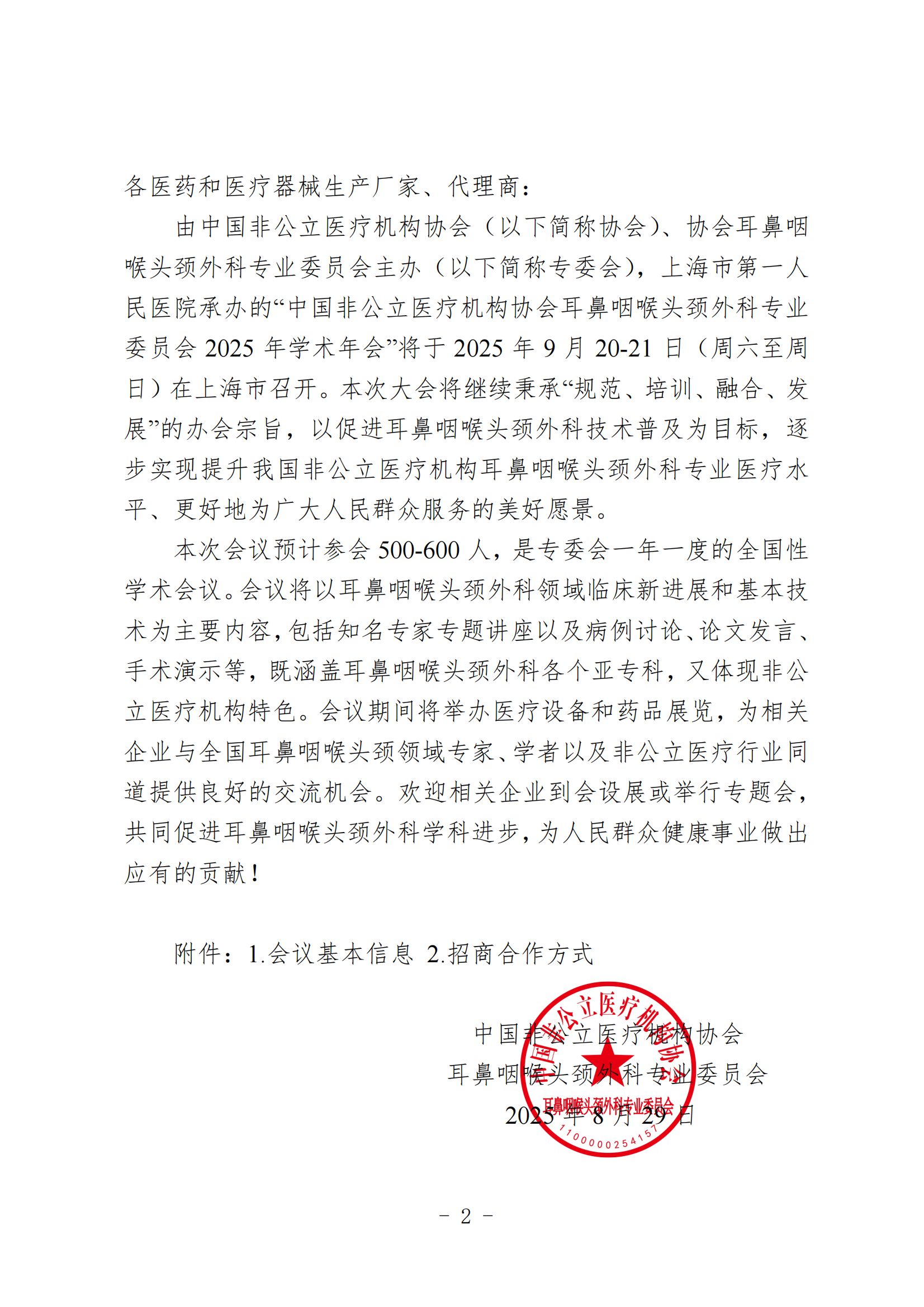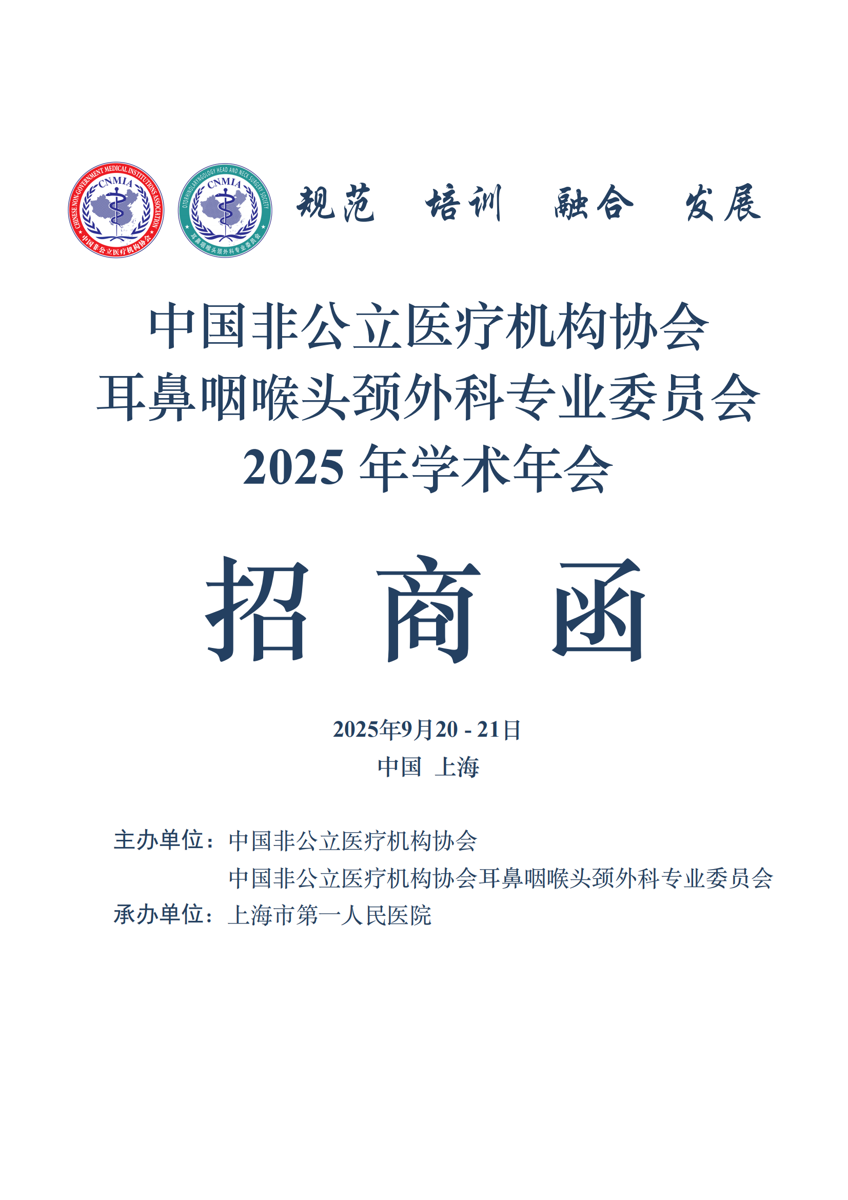 商務邀請函丨中國非公立醫療機構協會耳鼻咽喉頭頸外科專業委員會2025年學術年會招商函