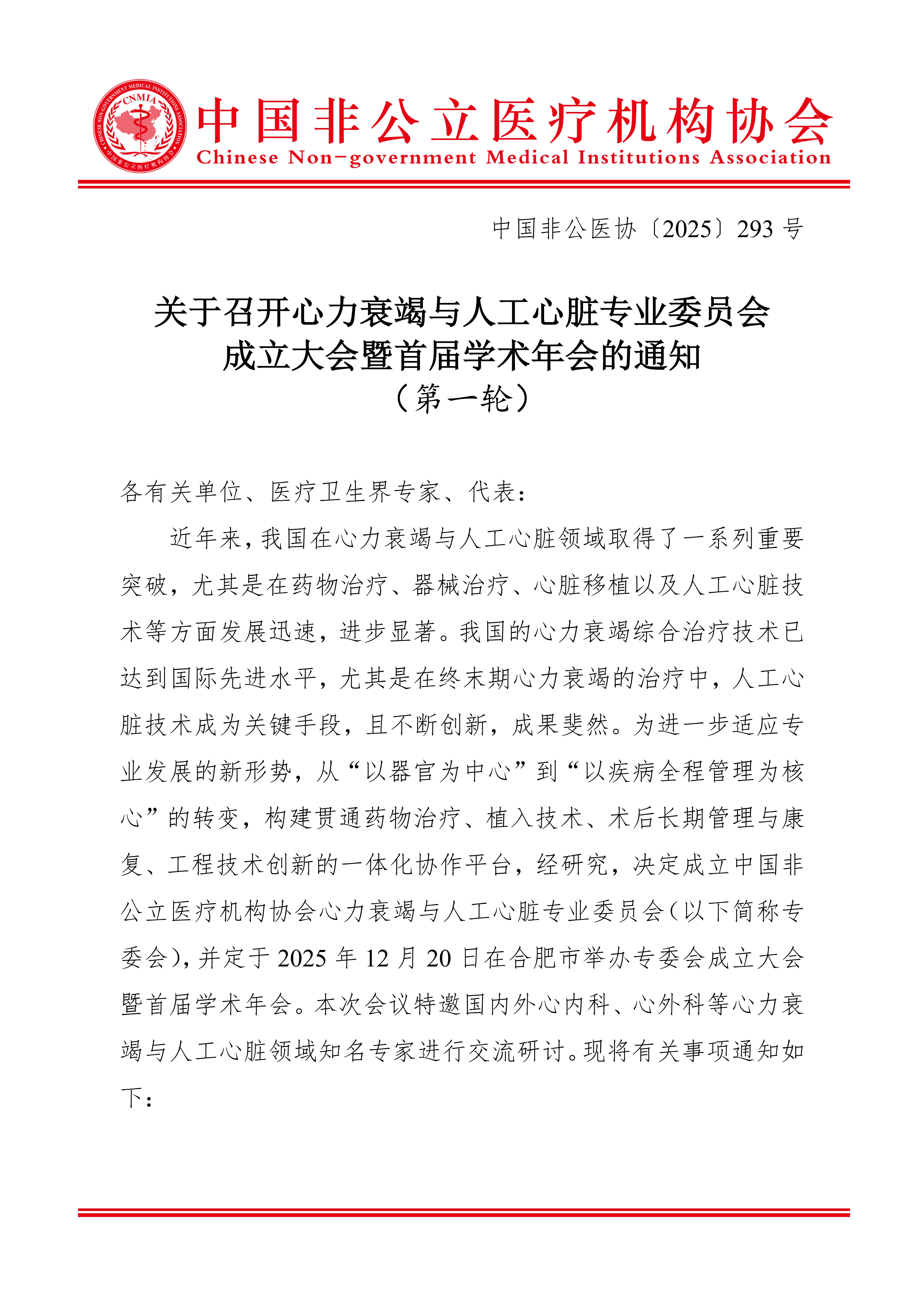 分支機構丨關于召開心力衰竭與人工心臟專業委員會成立大會暨首屆學術年會的通知(第一輪)