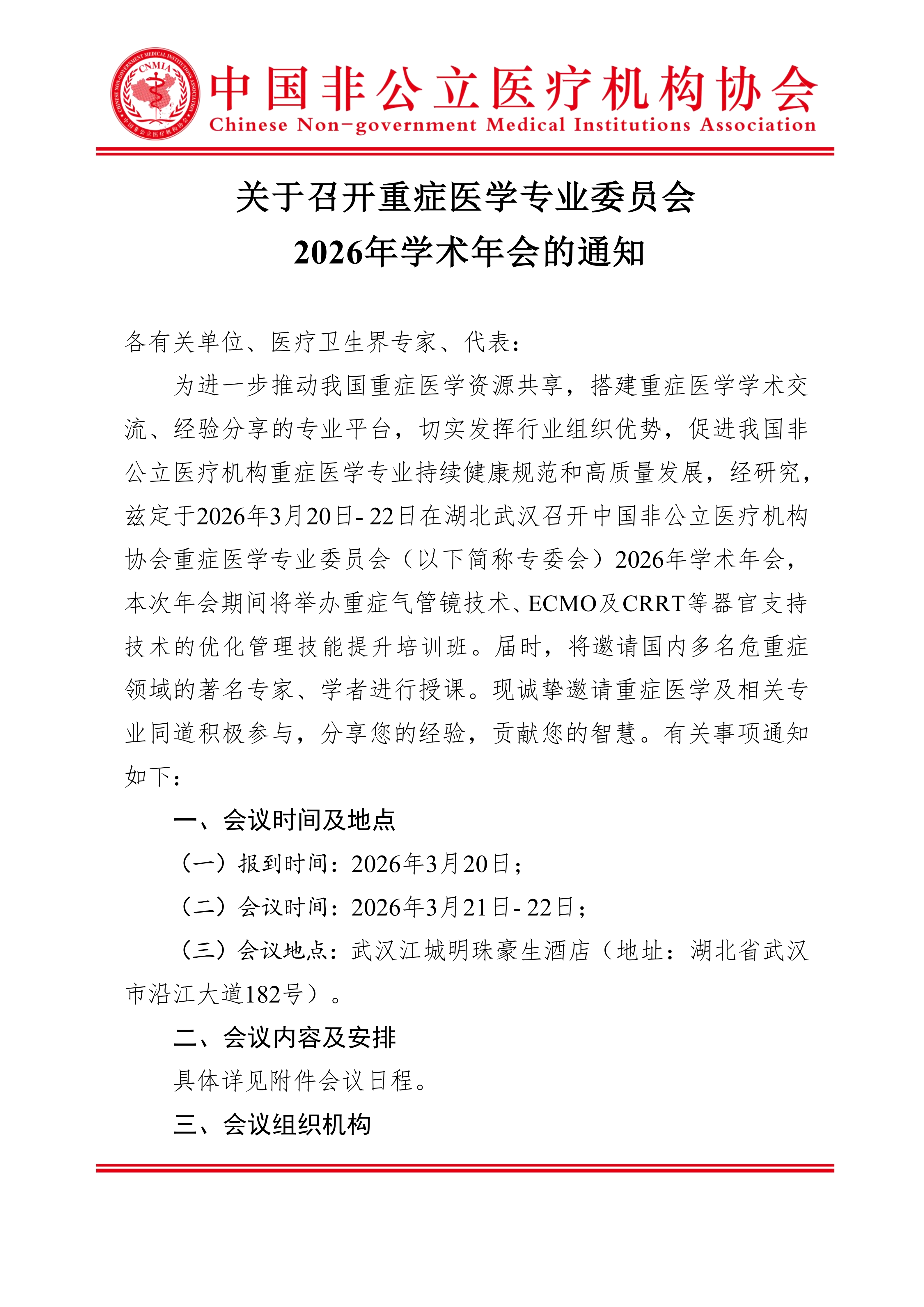 分支機構丨關于召開重癥醫學專業委員會 2026年學術年會的通知